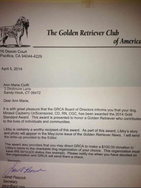 2015 … Libby earns the Golden Retriever Club of America's 2014 Gold Standard Award for her work in service to Sandy Hook and Newtown, CT